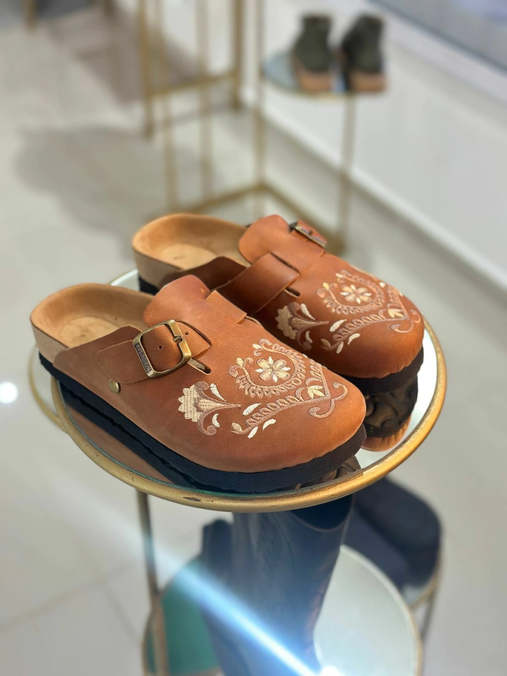 Zueco de cuero con detalle bordado