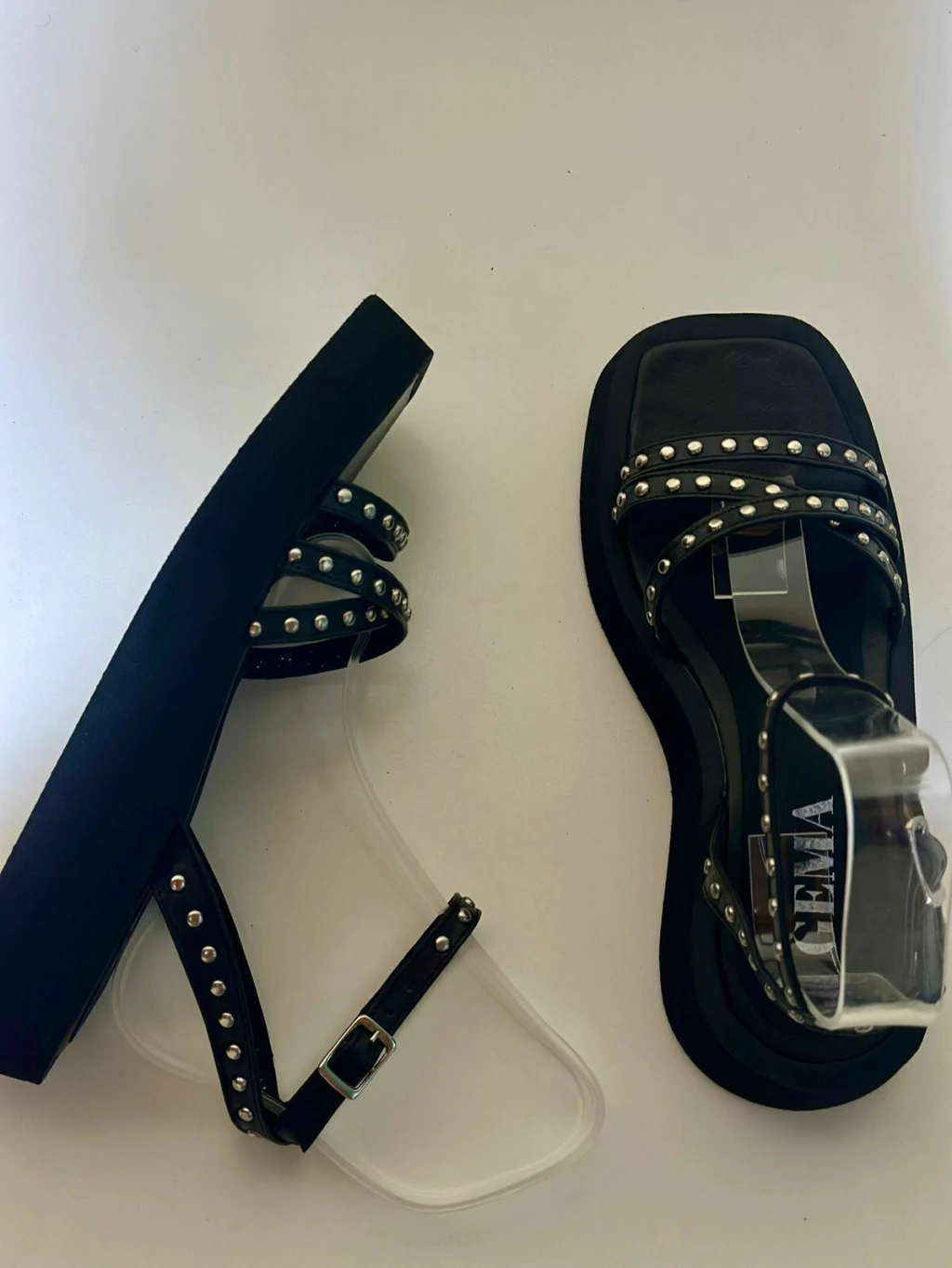Sandalias negras de cuero vacuno con plataforma de 4 cm en goma EVA, diseño con tiras y detalles de tachas que combinan estilo y comodidad.